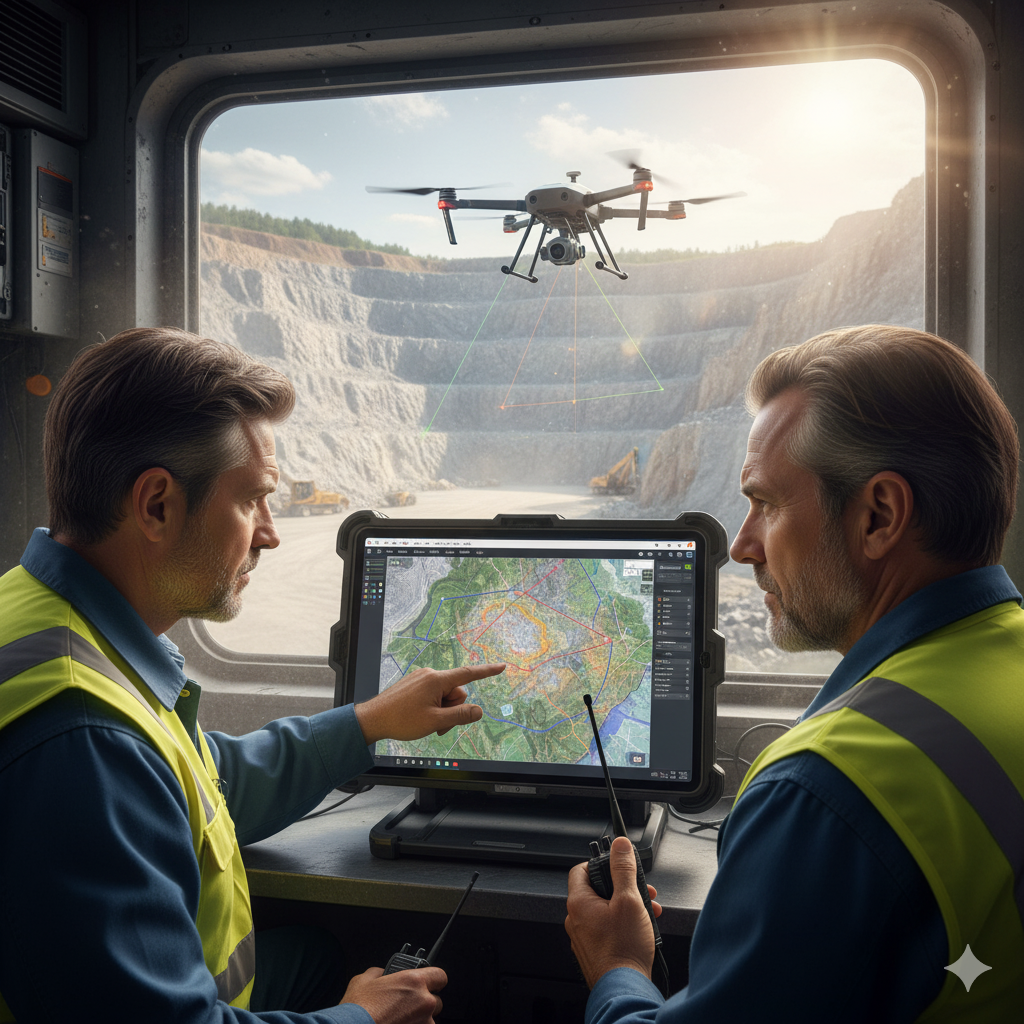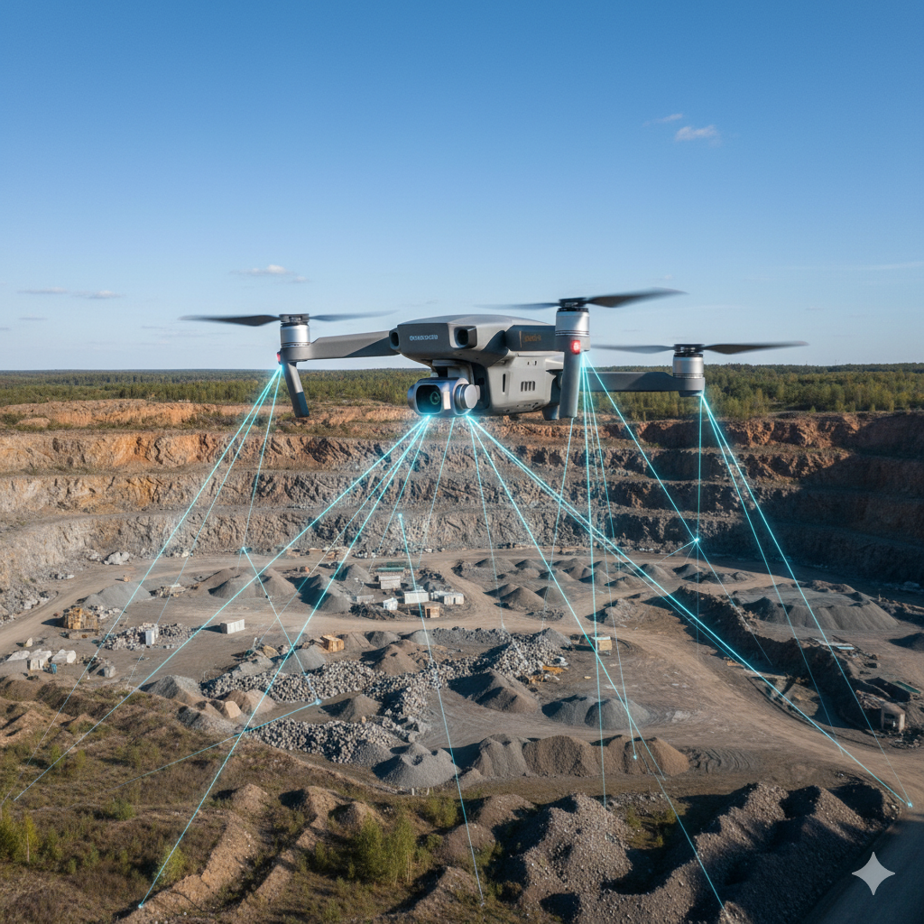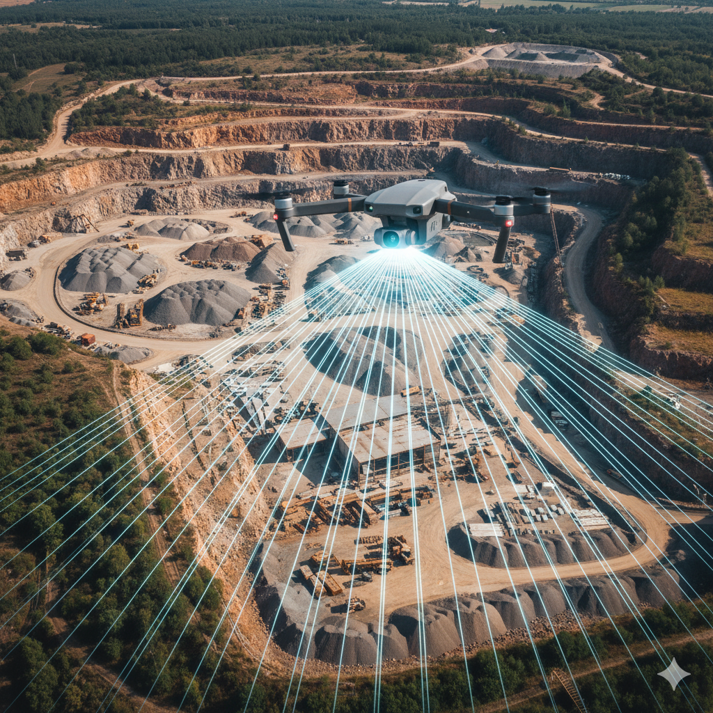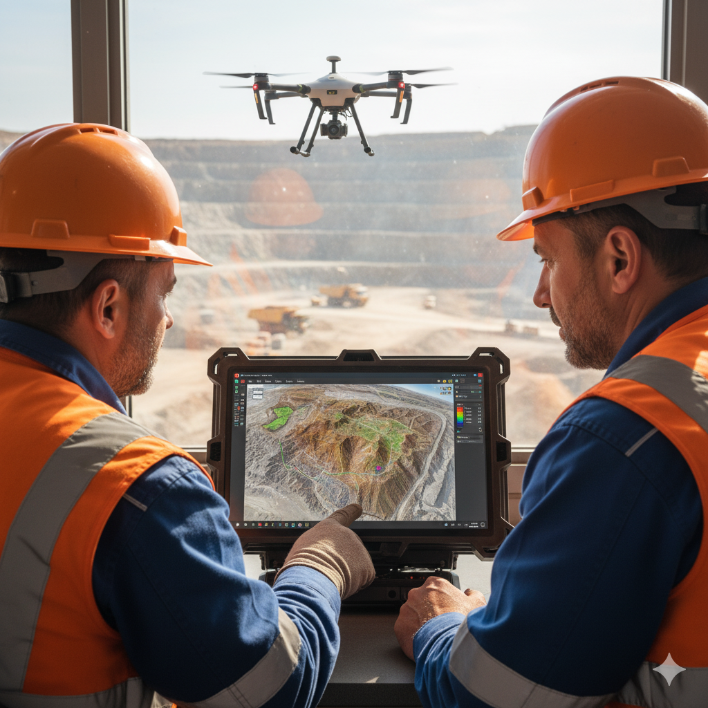 En explotaciones mineras, la ortofoto, curvas de nivel, mapas de pendientes y perfiles topográficos son fundamentales. Con vuelos con drones generamos nubes de puntos 3D para cálculos exactos de volúmenes y acopios. A través de triangulación obtenemos modelos 3D precisos que representan con fidelidad la superficie del terreno.